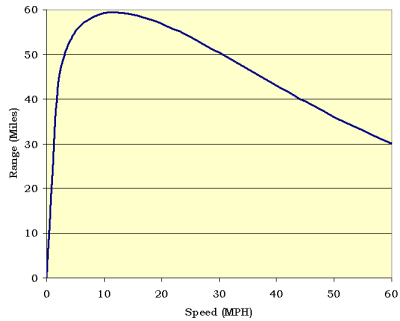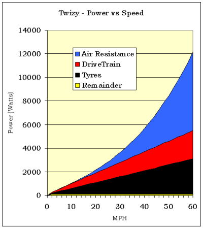 To understand why speed has such an impact on energy consumption, we need to know where the energy goes: some is lost as heat in the conversion from electrical to mechanical energy; a fair bit to the tyres; a fair bit to the drive-train, gears, bearings and brakes; and some to the control systems and (at night) the lights. Most of the large power drains increase roughly linearly with speed, so although you use twice as much to go twice as fast, it shouldn’t affect how far you can go because you take half the time. But above about 10mph you are also subject to air resistance, whose force increases with the cube of the speed, which means that the power to overcome it goes up with the square. So by about 50mph pushing the air aside is accounting for at least half the power expended while at 25mph it accounts for less than a quarter.