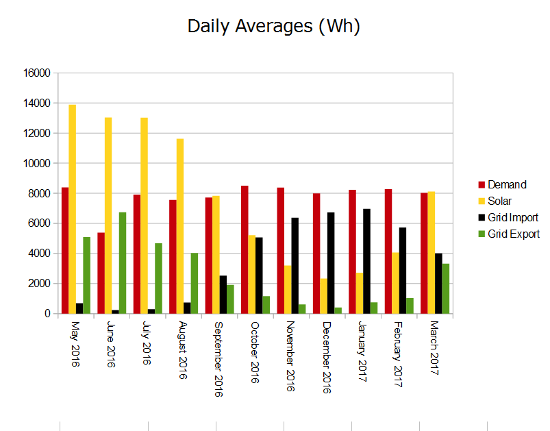 As the days get longer, our solar generation increases. March actually generated about the same as last September but the Wattstor battery control system is cautious about allowing the batteries to discharge beyond 70% or so until it’s confident there’s enough light hours in the day to fill them. Our lead acid batteries perform better and last longer if fully charged, but they won’t charge at high power for the last 15% or so of their capacity, so won’t reach 100% until the days are several hours longer. We think this explains why, despite there being as much solar generation in March as in September, this month saw both much higher grid export and import as the batteries were not maximising their storage capacity to the same extent.