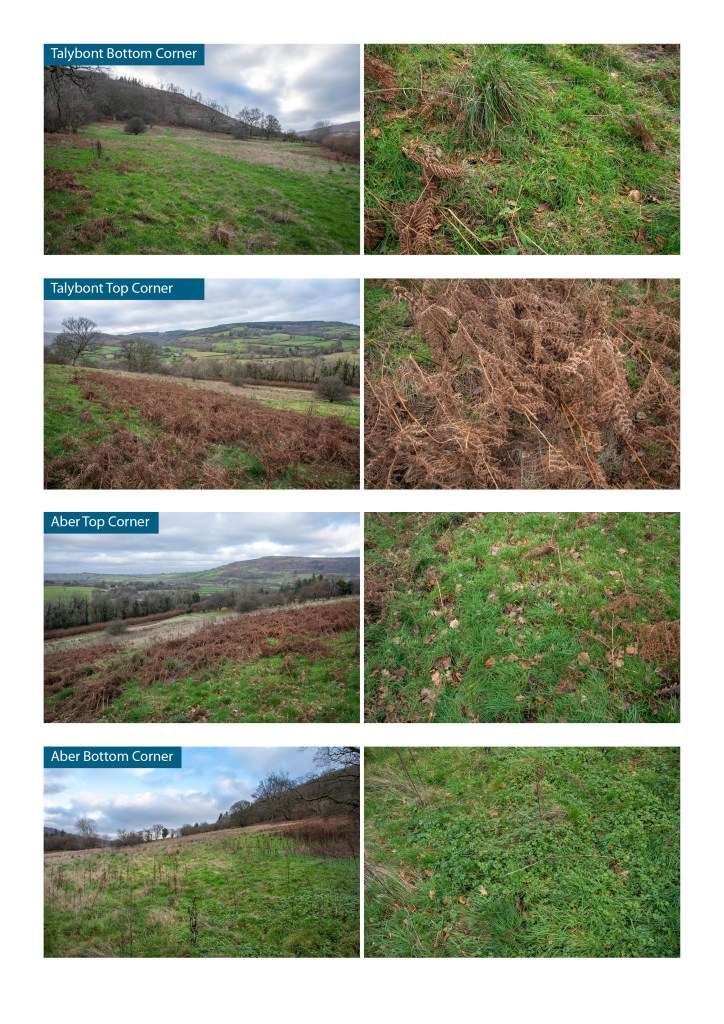The sheep have been removed and the field is now undisturbed. We have selected 4 corners of the field (next to either woodland or hedges) labelled below as Talybont Bottom Corner (TB), Talybont Top Corner (TT), Aber Bottom Corner (AB) and Aber Top Corner (AT).